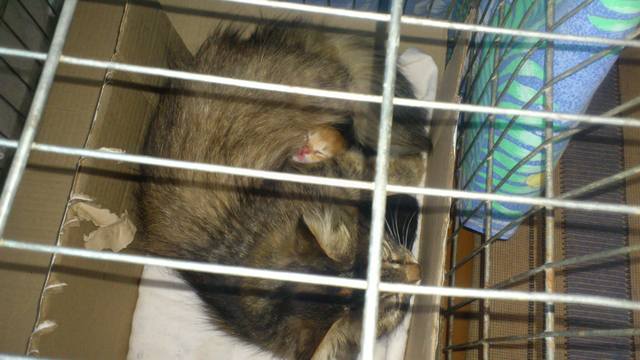 Кошка красивая, но истощенная. Я ее сняла, там рыжая мордочка котенка видна.  Котят трое: два кота и кошка окрашены интересно: рыжий; темно-серый, почти черный с полосами, и дымчатая кошечка. Кошку-мать знакомая себе хочет оставить, не знаю, как с собаками будет ее мирить.