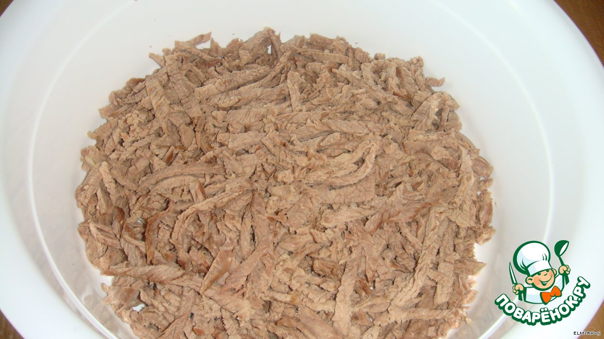 Мясо отварите и нарежьте поперёк волокон.